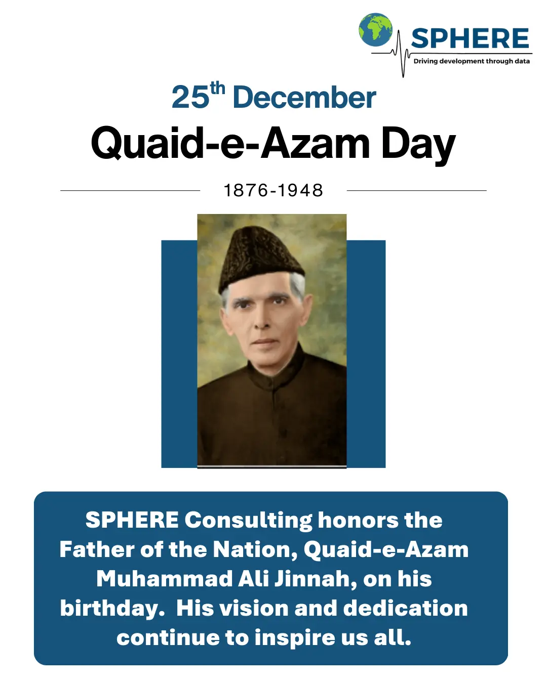 25th December – Quaid-e-Azam Day 🇵🇰 SPHERE Consulting honors the Father of the Nation, Quaid-e-Azam Muhammad Ali Jinnah, on his birthday.